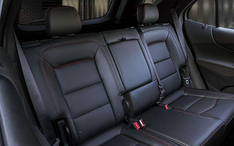 The 2022 Chevrolet Equinox RS features blacked-out trim, unique dark painted aluminum 19-inch wheels, LED headlights, RS badging, black cloth upholstery, and red stitching throughout the interior.