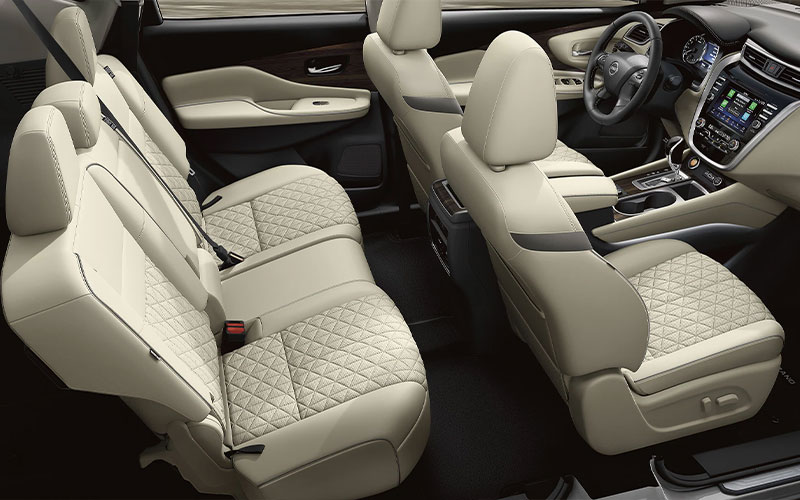 Sitting atop the 2023 Murano trim hierarchy is the Platinum model with its panoramic moonroof, heated and ventilated front seats, and NissanConnect app with features like auto-collision notification and a stolen vehicle locator. The best part of the Platinum is the semi-aniline leather upholstery with diamond-quilted inserts available in black, beige, or brown.