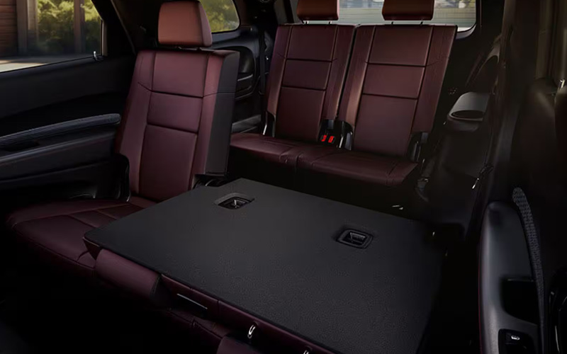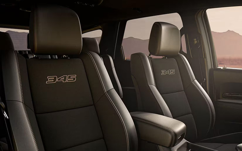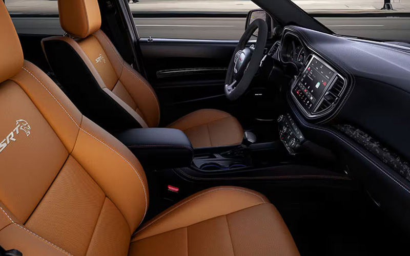 The Dodge Durango comes with three rows of seating and room for 7 in base setup or 6 when the available second-row captain chairs are fitted. Materials range from cloth on entry-level models to Nappa leather with suede inserts on the Hellcats.