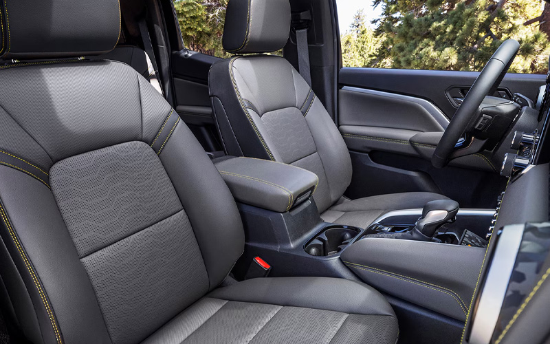 Only sold as a crew cab with 5 seats, the 2025 Chevy Colorado has 35 inches of rear legroom, and all models come with backseat HVAC ducting. Even on base Work Truck models, cloth upholstery, carpeted flooring, and automatic climate control are included.