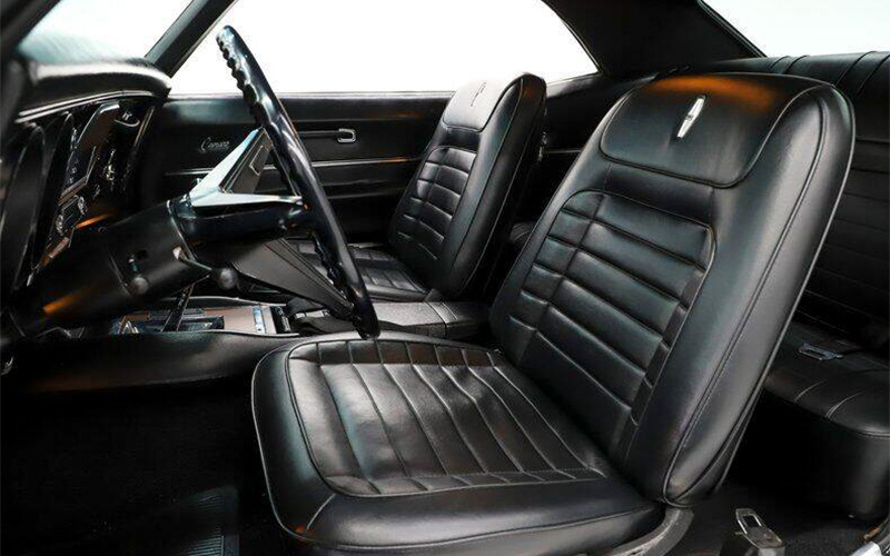 Many years later, this ’68 Camaro was given a full-rotisserie restoration from stem to stern. Every detail has been attended to and it shows. The tuxedo black paint job is mirrored by the black leather interior. Wheels are staggered 15-inch Cragers clothed in Mickey Thompson tires. Rather than upgrade, this restoration kept things as close to factory as possible, with reproduction hoses and clamps, a proper Holley dual-feed carburetor, and GM aluminum intake. The exhaust has seen upgrades including new Flowmaster mufflers.
